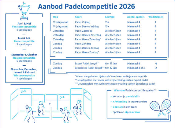 In 2026 bestaat het competitieaanbod padel wederom uit 4 competities: een Voorjaars-, Zomer-, Najaars-, en Wintercompetitie. Dit betekent dat spelers het hele jaar door competitie kunnen spelen. Het voorjaar, zomer en najaar bevatten 5 speelrondes, de winter heeft 7 speelrondes.